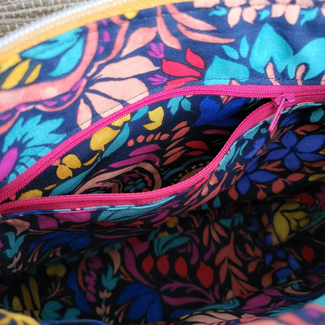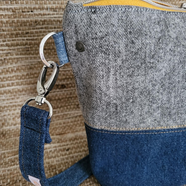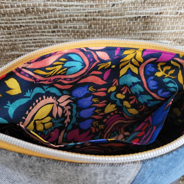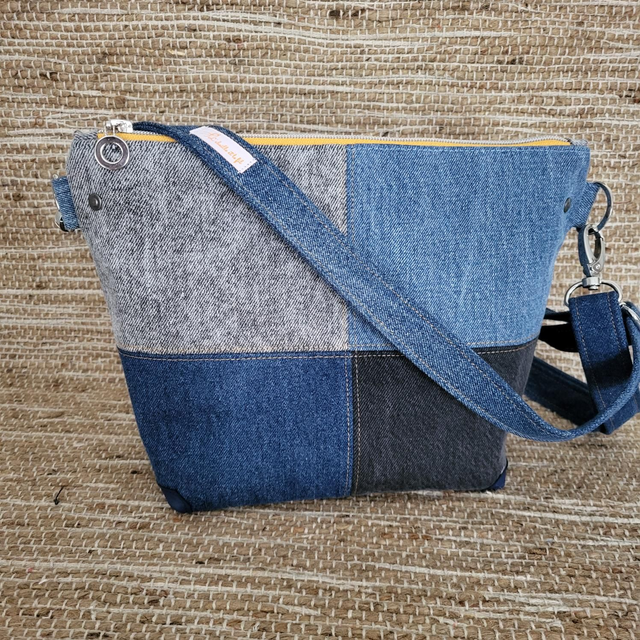 Ce sac à main avec bandoulière réglable est une création originale, unique, faite main en France. Peut se porter à l'épaule ou sur la poitrine. Le sac et la bandoulière sont créés à partir de jean upcyclé; la doublure intérieure a un motif fleurs sur fond blanc. L'intérieur du sac est doté d'une pochette de 19cm x12 cm et d'une pochette zippée de 19x13 cm. Le corps du sac est réalisé avec un patchwork de pièces en jean upcyclé coloris gris, gris chiné, bleu clair et moyen; réhaussé de surpiqûres ocres. Fermeture zippée, curseur rond. Grâce à un entoilage spécifique qui assure robustesse et solidité, le sac a un maintien rigide.
