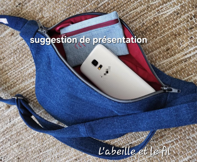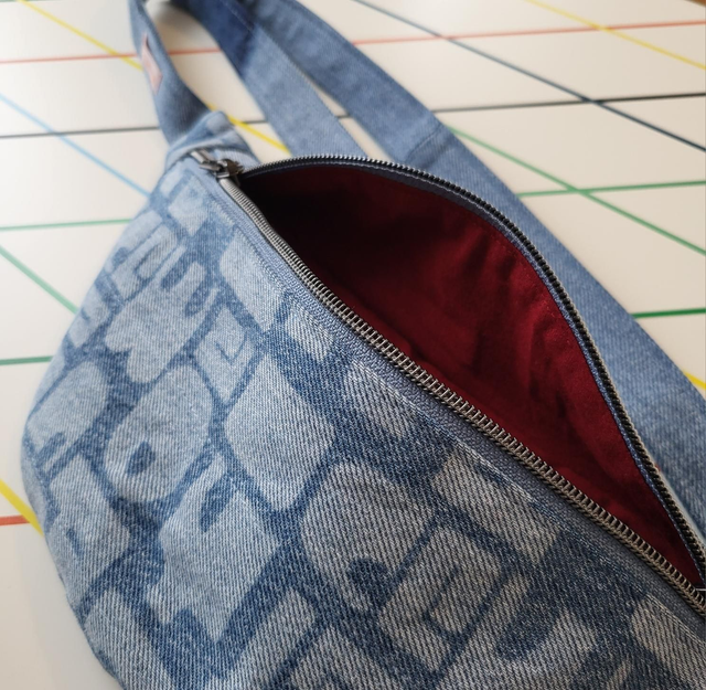 Ici, modèle Taille M en denim surcyclé bleu impressions, surpiqûres ton sur ton, intérieur bordeaux