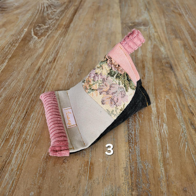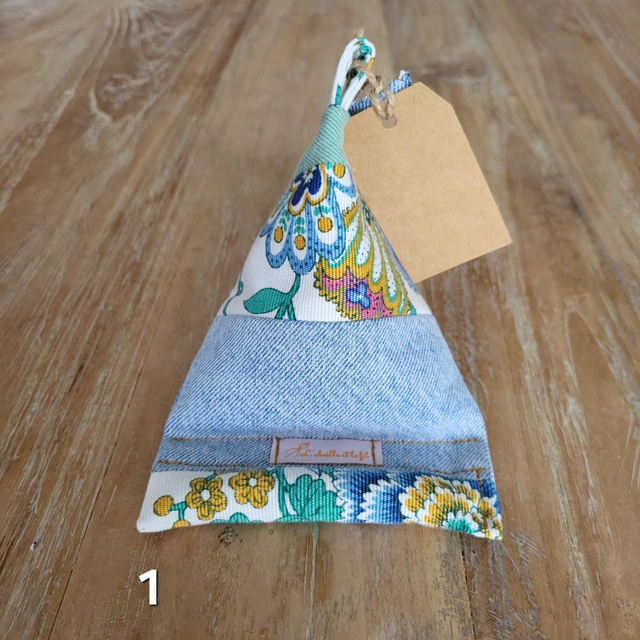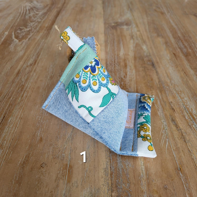 Support de téléphone en jean recyclé. Accessoire de téléphone en patchwork de jeans et tissu pour apporter une touche déco tendance à votre intérieur ou votre bureau. Support de téléphone original et nomade, il est crée avec du jean 100 % recyclé.